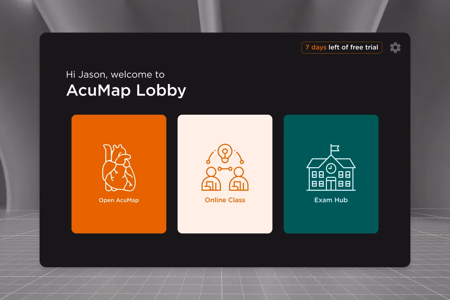 The Lobby is the place where you can decide what you want to do in AcuMap after logging in. You can choose to explore the 3D model, engage with peers or instructors in online class, take exams to assess how much you’ve learned.