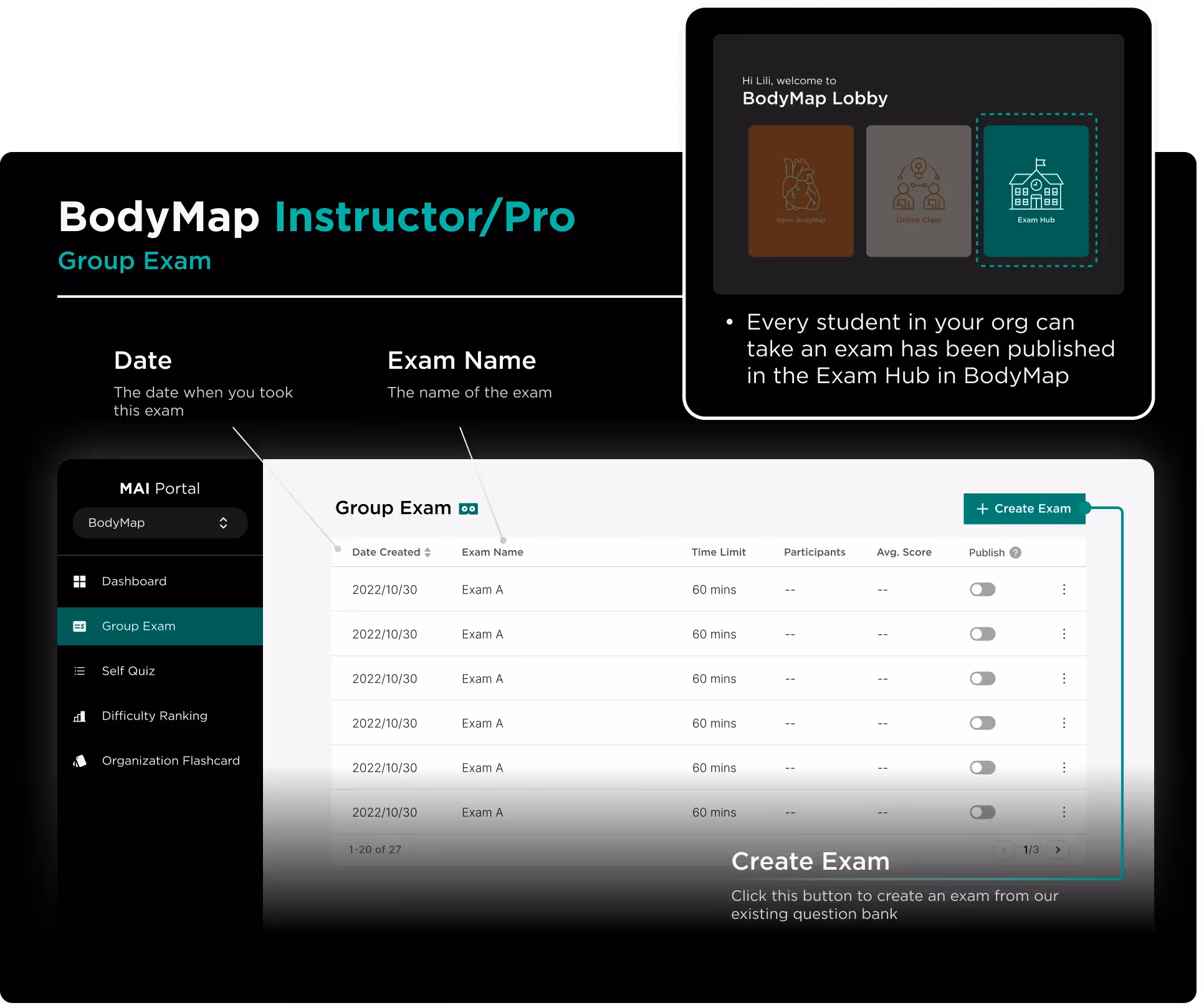 The Group Exam is a list of exams consisting of questions from our existing question bank, with each question being equivalent to a structure, that you can create on MAI Portal for students to take in BodyMap.