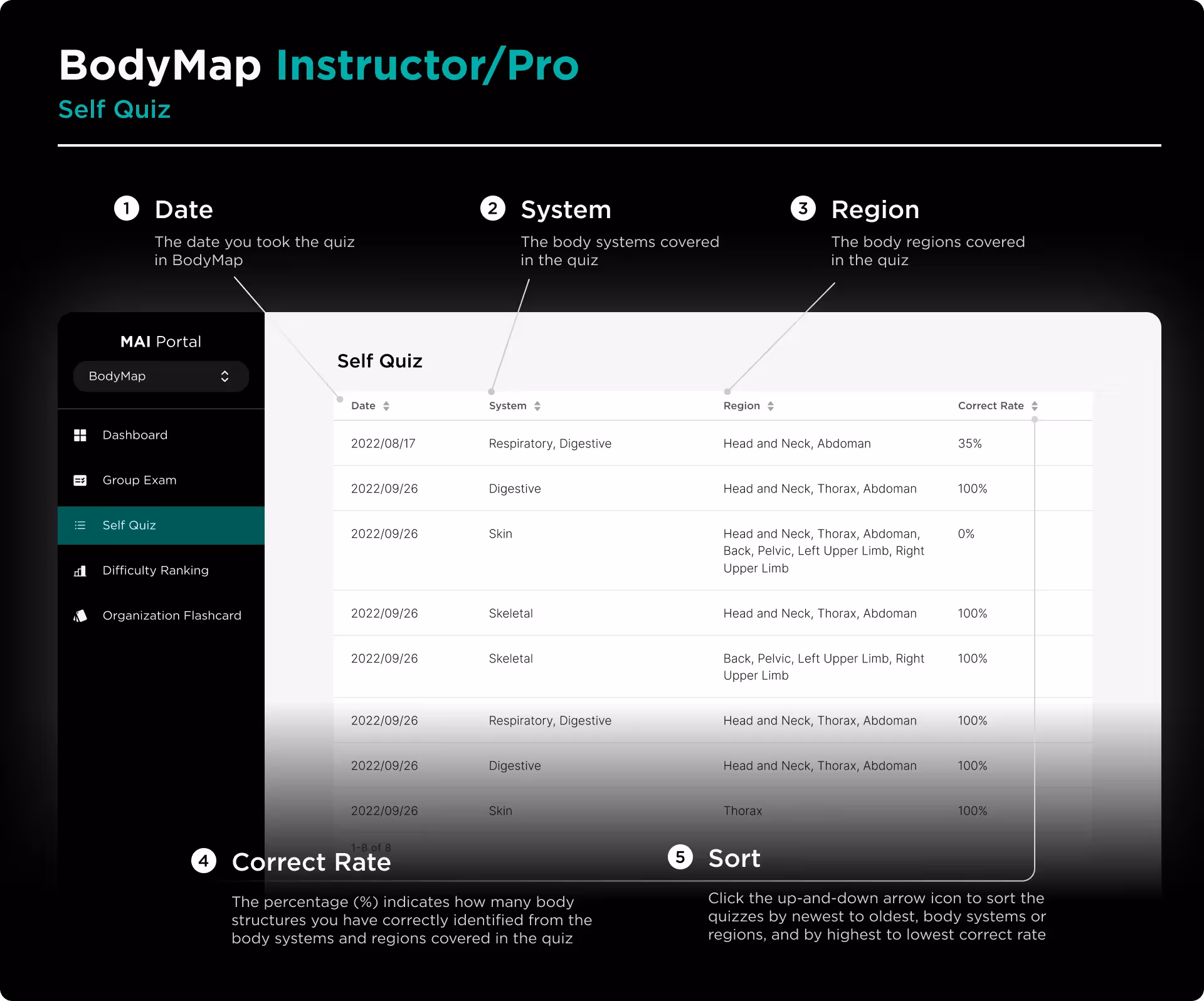 The Self Quiz is a section on MAI Portal that lists out the information of each quiz you have taken in BodyMap. Information include which body systems, body regions and body structures were covered in the quiz, how successful you were at identifying the structures, and which structures you’re having difficulty with.