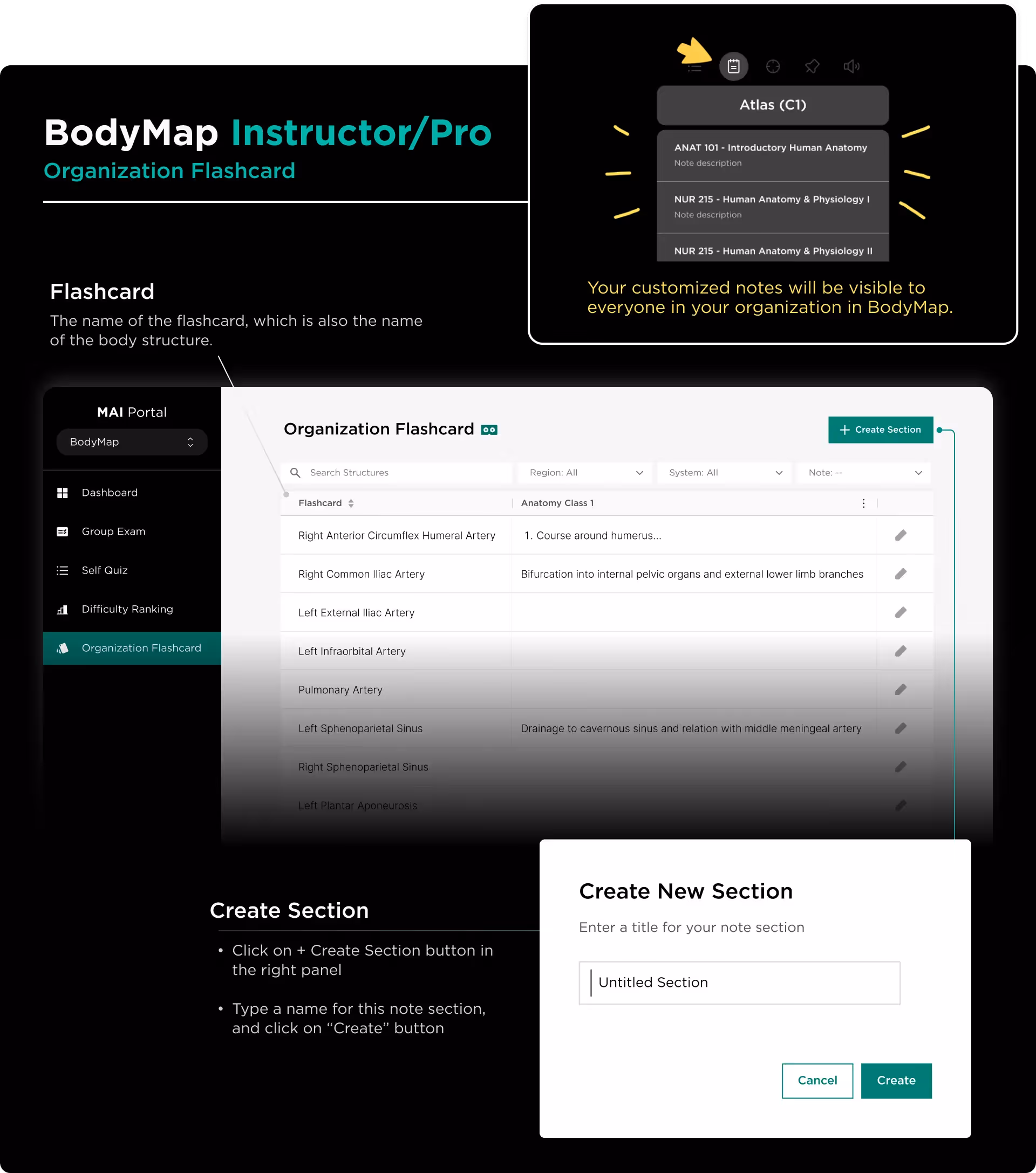 The Organization Flashcard is a section on MAI Portal where you can add, edit and delete the organization note of the flashcard of each body structure which is visible to everyone in your organization in BodyMap.
