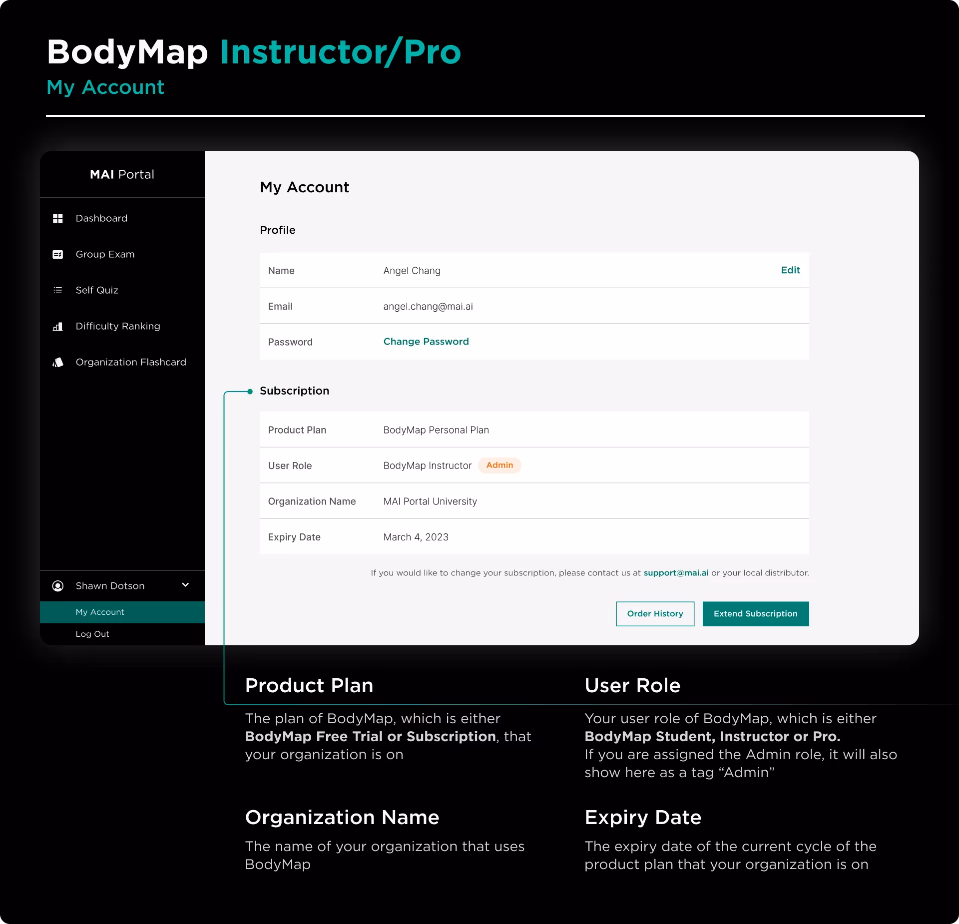 The MAI Portal is a web-based platform that boosts your learning or teaching experience in BodyMap. It enables you to track your quiz results, customize your flashcard notes, view and update your account information, and more.